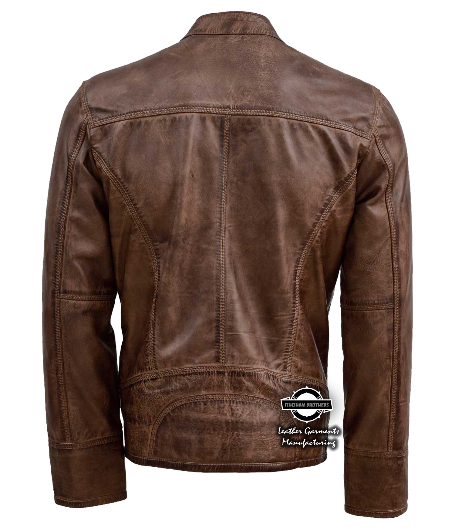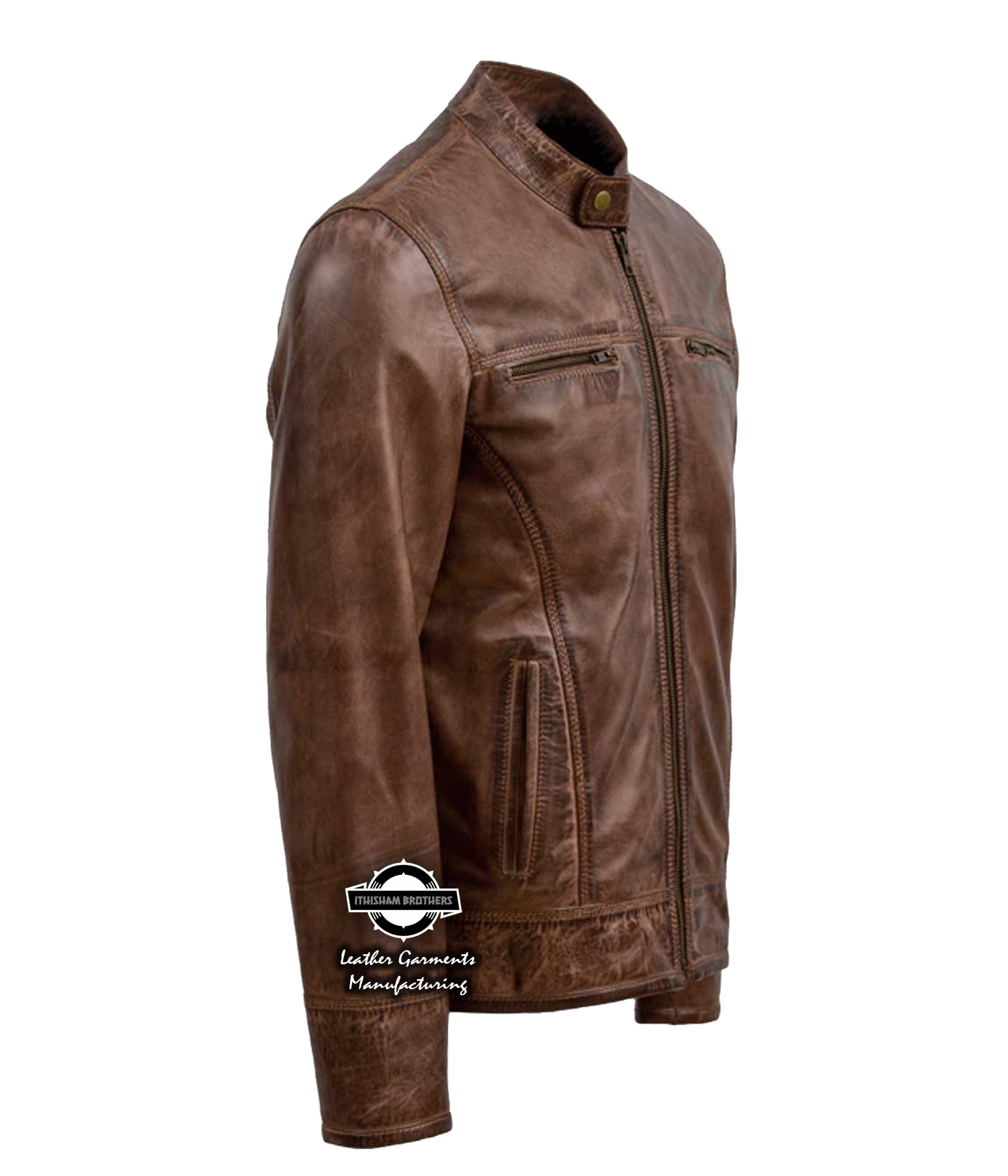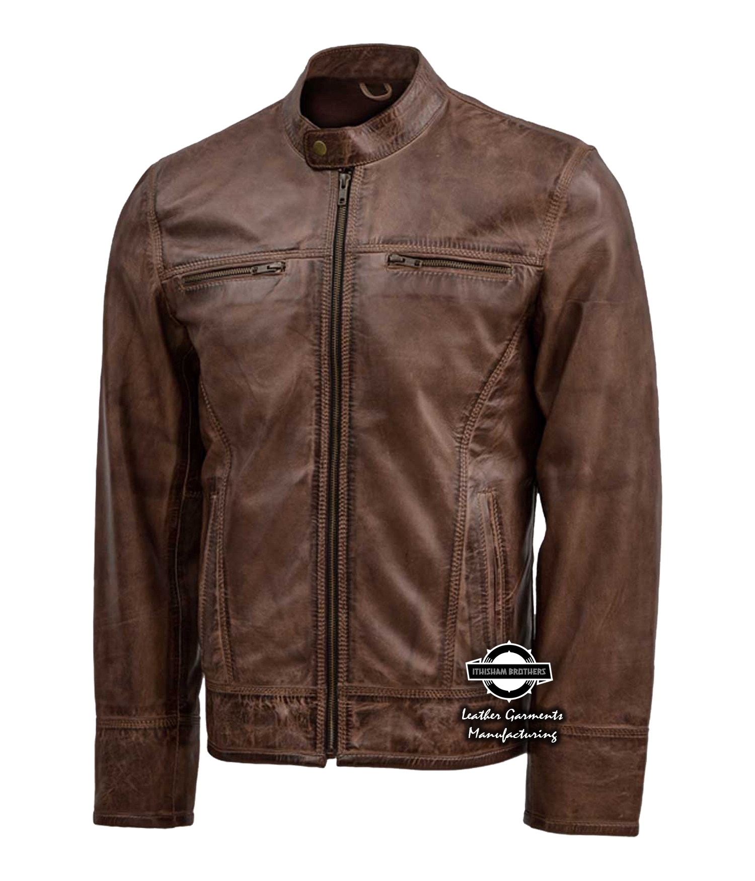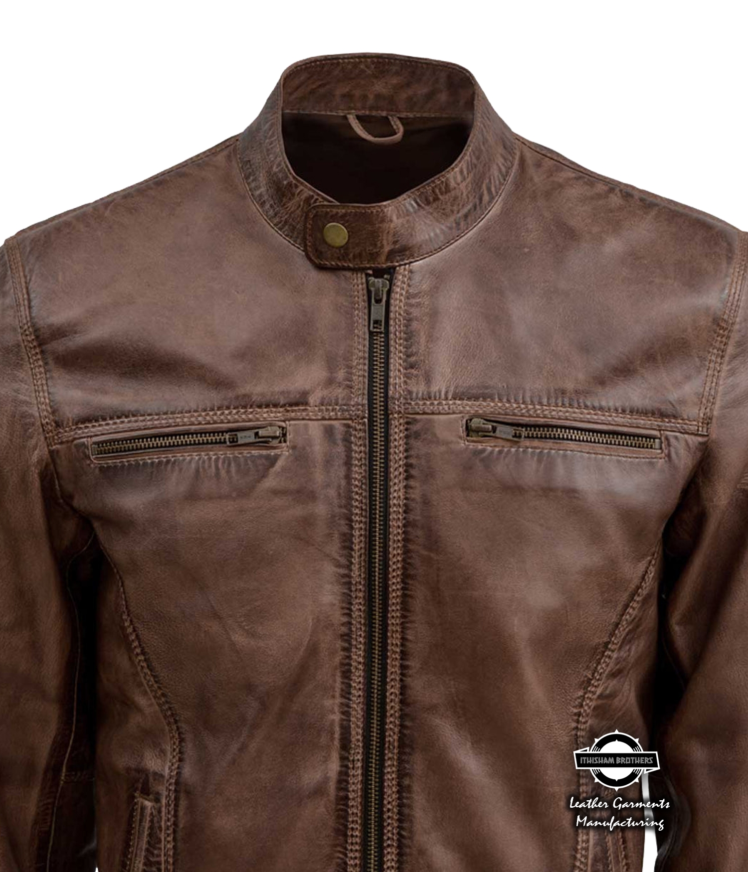 Experience timeless style with our Vintage Brown Café Racer Leather Jacket, crafted from 100% premium cowhide leather. Designed for riders and fashion-focused men alike, this jacket delivers durability, comfort, and a rugged vintage charm. Featuring a stand collar with snap button, smooth YKK front zipper closure, and two horizontal chest zipper pockets, the jacket combines practicality with classic biker aesthetics. The natural grain and distressed finish give it an authentic, worn-in look that becomes better with age. Whether you wear it casually or on the road, this leather jacket promises long-lasting performance, warmth, and standout style.