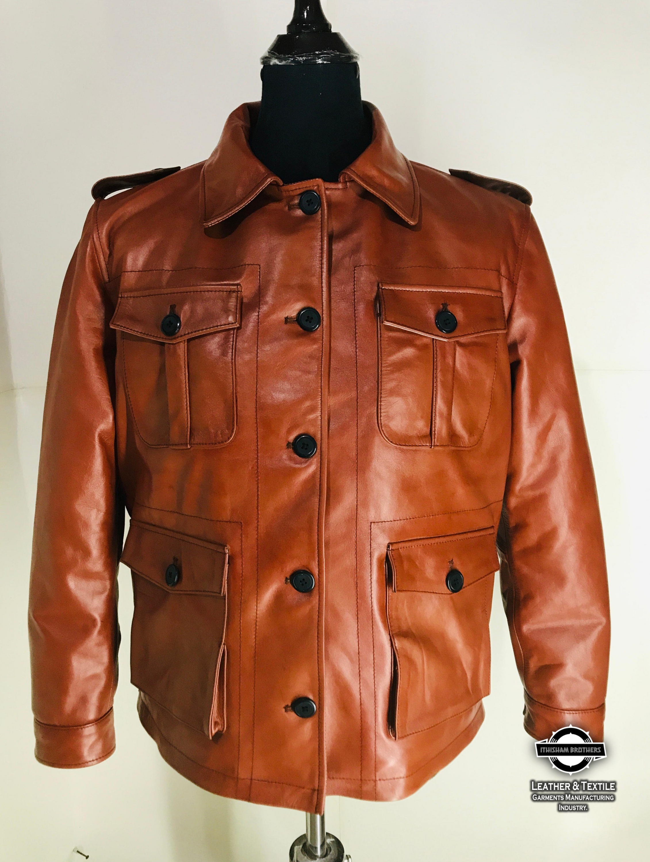 Upgrade your outerwear collection with this premium cognac brown genuine leather jacket, crafted for men who appreciate timeless style and durability. Designed in a classic field jacket silhouette, this piece features a structured collar, full front button closure, and four functional flap pockets for both style and practicality. Made from high-quality genuine leather, the jacket offers a smooth, rich finish that ages beautifully over time. The tailored yet comfortable fit makes it perfect for everyday wear, casual outings, travel, or smart-casual looks. Reinforced stitching and durable hardware ensure long-lasting performance in all seasons. Manufactured with precision by Ithisham Brothers Manufacturing Industry, this jacket reflects expert craftsmanship, premium materials, and attention to detail—ideal for modern men seeking elegance with utility.