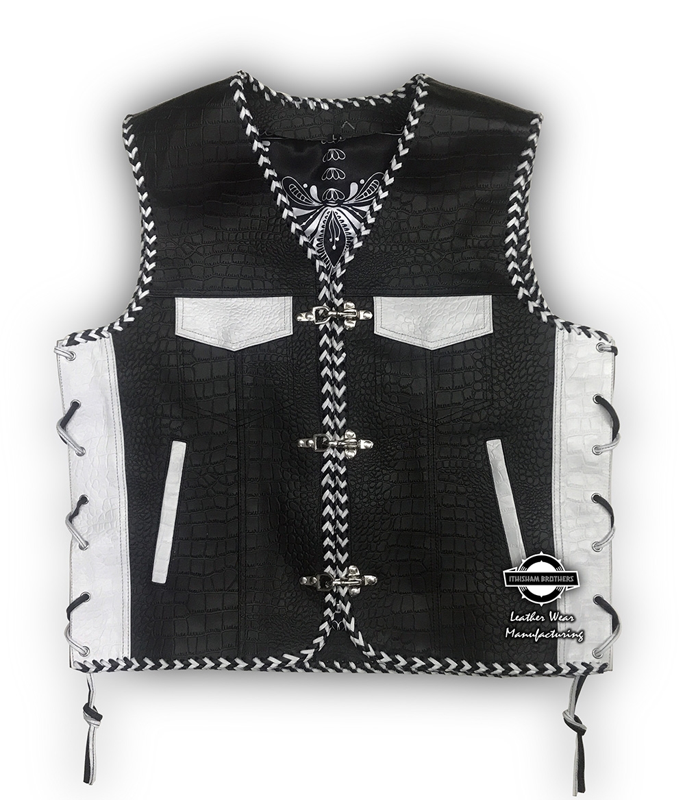 This high-quality leather vest is designed with a unique crocodile-patterned finish in black and white, adding a touch of elegance and toughness. The vest features stylish white lace-up details on the sides, offering adjustable fitting and enhancing its stylish look. The center clasp closure with silver hardware adds an edgy touch, while the intricate bandana-inspired lining at the collar gives it a classic, vintage feel. Perfect for bikers, fashion enthusiasts, or anyone looking to make a bold fashion statement.