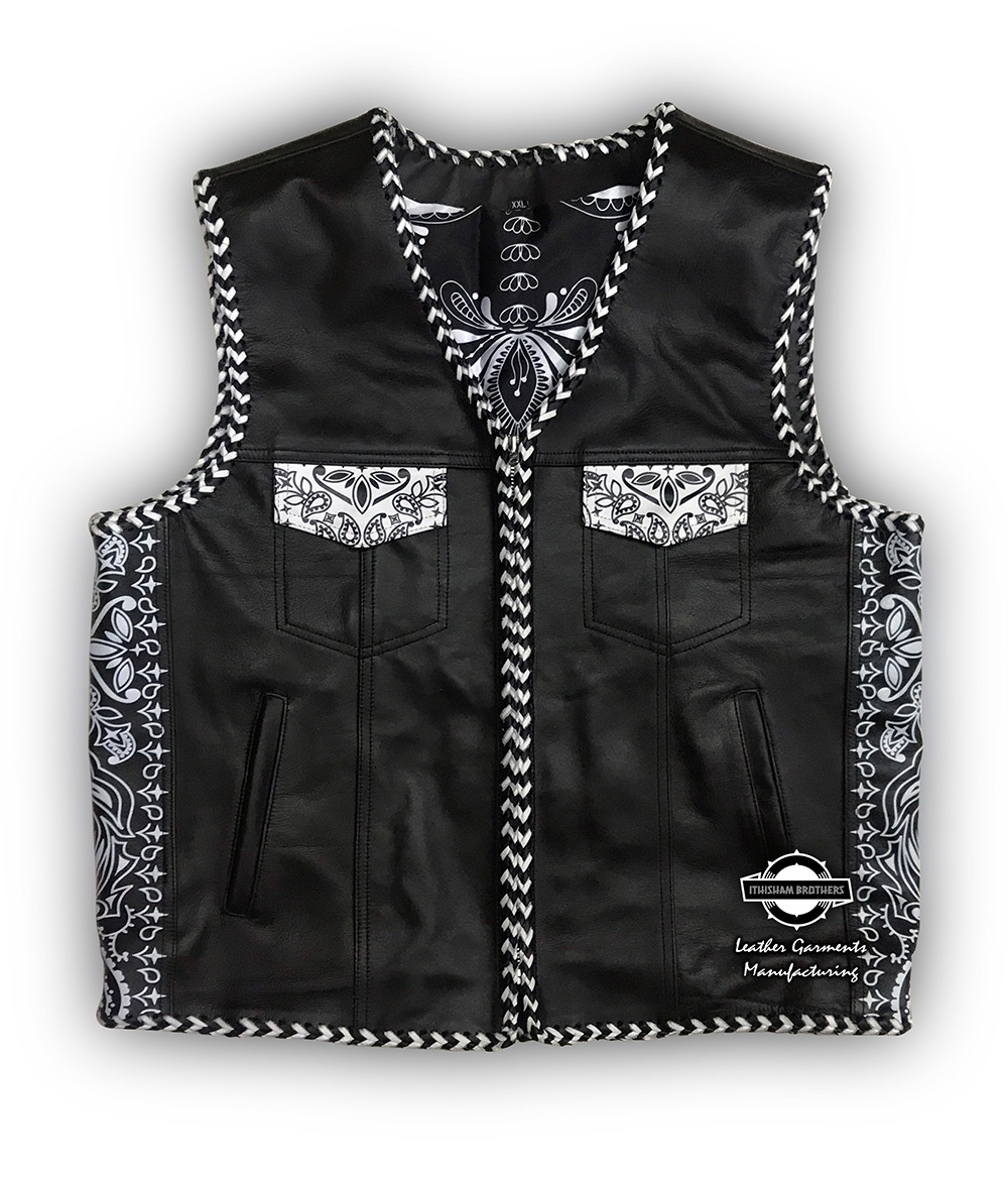 Elevate your biker look with this Black Leather Bandana Trim Vest by Ithisham Brothers Manufacturing (IBM). Crafted from high-quality genuine leather, this vest features an exclusive black & white bandana printed border and chest pocket detailing, giving it a bold and standout street look.